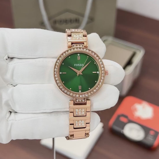 Fossil Premius Karli Women's watch radiates timeless charm with its rose gold tone and shimmering crystal accents add a perfect blend of sophistication and sparkle luxury on the wrist.
